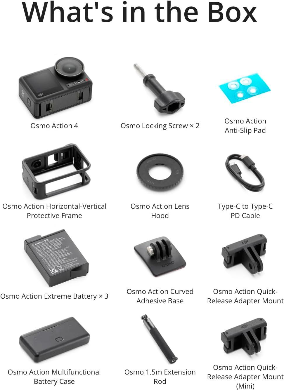 Комплектація Екшн-камера • бленда • швидкознімне перехідне кріплення • швидкознімне перехідне кріплення • акумулятор 3 шт • PD-кабель USB-C • стопорний гвинт Osmo 2 шт • багатофункціональний чохол • наклейка з логотипом DJI • горизонтально-вертикальна захисна рамка • майданчик • монопод