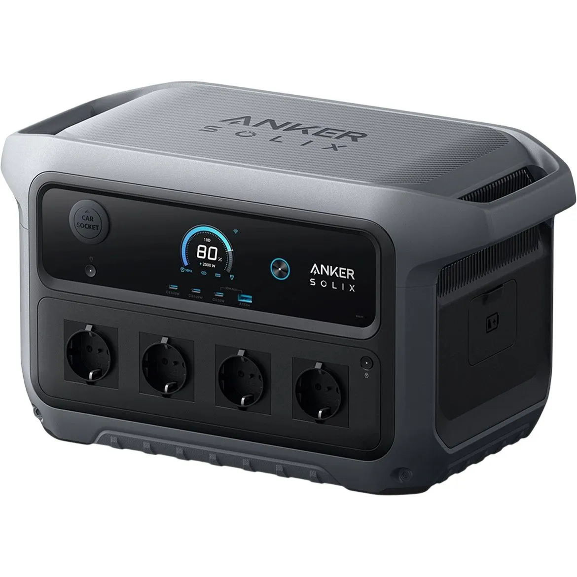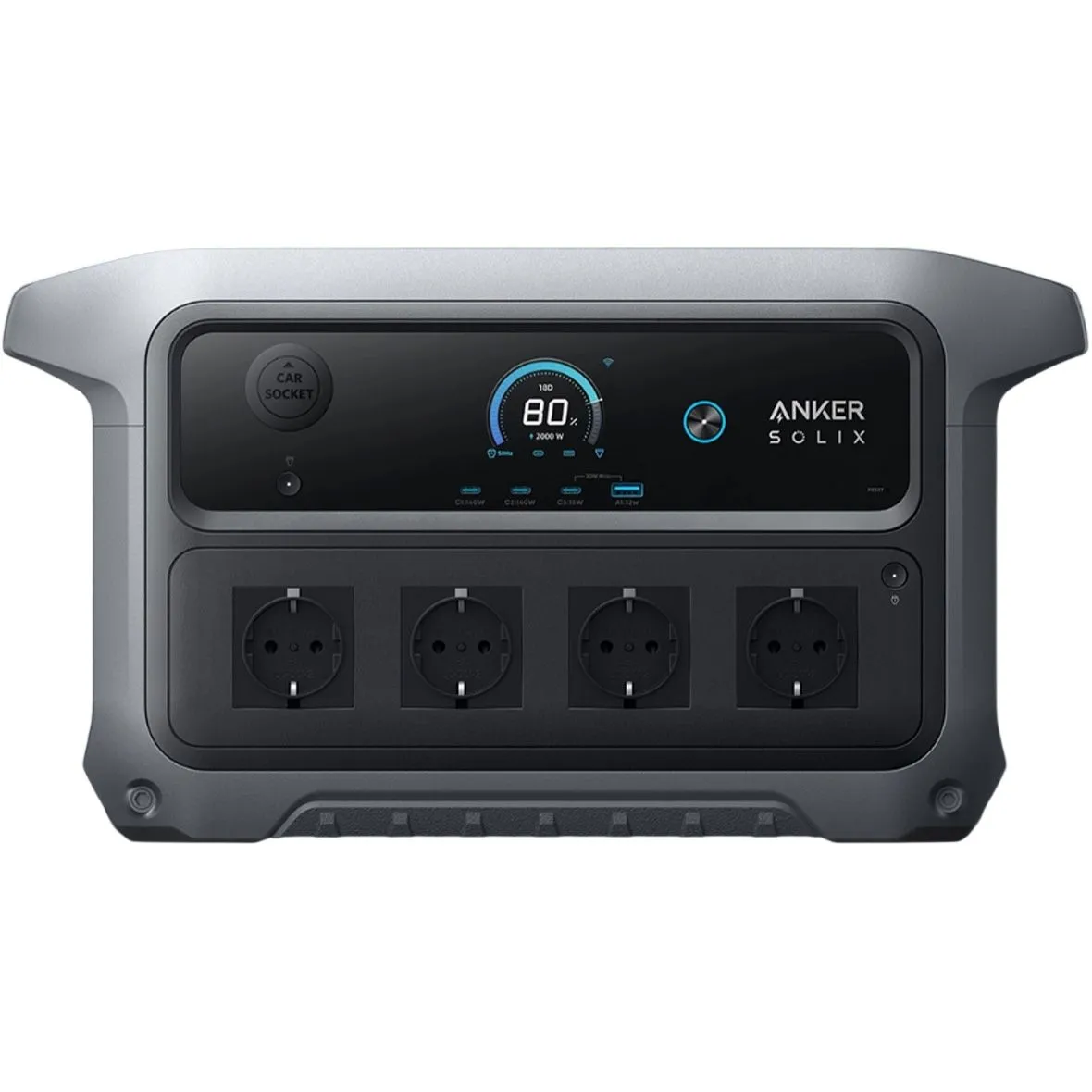Станція оснащена чотирма розетками 230 В і широким набором портів постійного струму. В наявності потужні USB-C порти до 140 Вт, додатковий USB-C, USB-A і автомобільний вихід 12 В, що дозволяє одночасно живити ноутбуки, смартфони, побутову техніку і периферійне обладнання. Така конфігурація робить пристрій універсальним рішенням для різних сценаріїв використання.